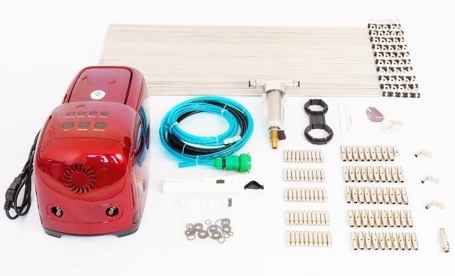 Комплектациянасосный модуль, входной фильтр со шлангами, форсунки 0.15 мм с нерж. фильтрами 20шт, соединители под форсунки 1/4″ 19шт, концевик по форсунку 1/4″ 1шт, стартовый фитинг 1/4″ 1шт, труба нейлон 1/4″ 35м, трубка нержавейка 1/4″ 75см 19шт, клипсы крепежные 12шт, угол 90 градусов 1/4″ 2шт, ножницы 1шт, паспорт, запчасти 1кпл