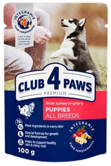 Hrană umedă pentru câini Club 4 Paws Puppies All Breeds with Turkey in Gravy 80g