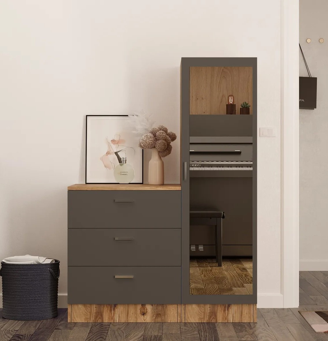 Cu trei sertare spațioase și numeroase rafturi, comodul oferă loc suficient pentru haine, cărți sau obiecte de uz casnic. Fiecare lucru își găsește locul, permițându-vă să vă bucurați de un spațiu ordonat și bine organizat.