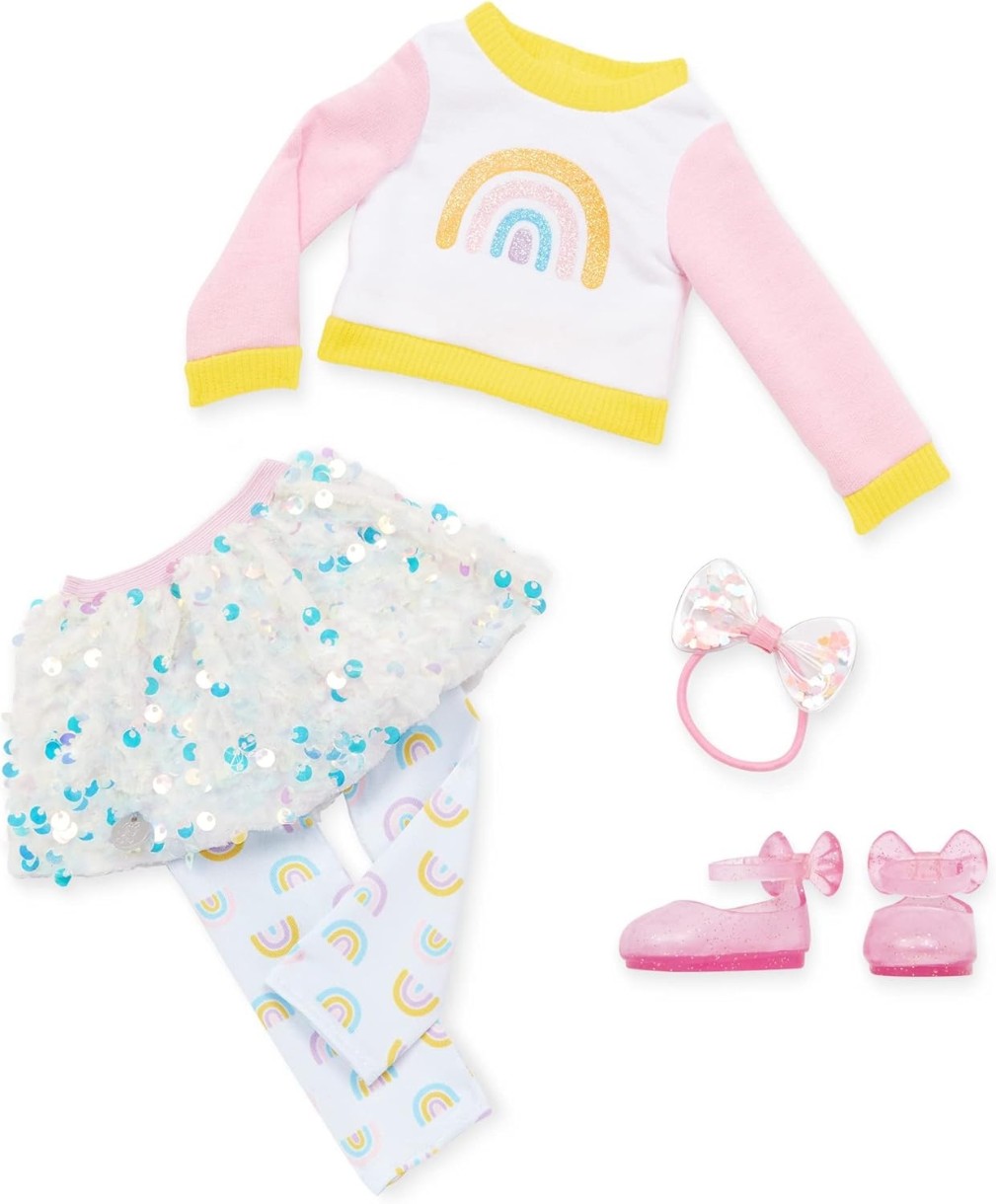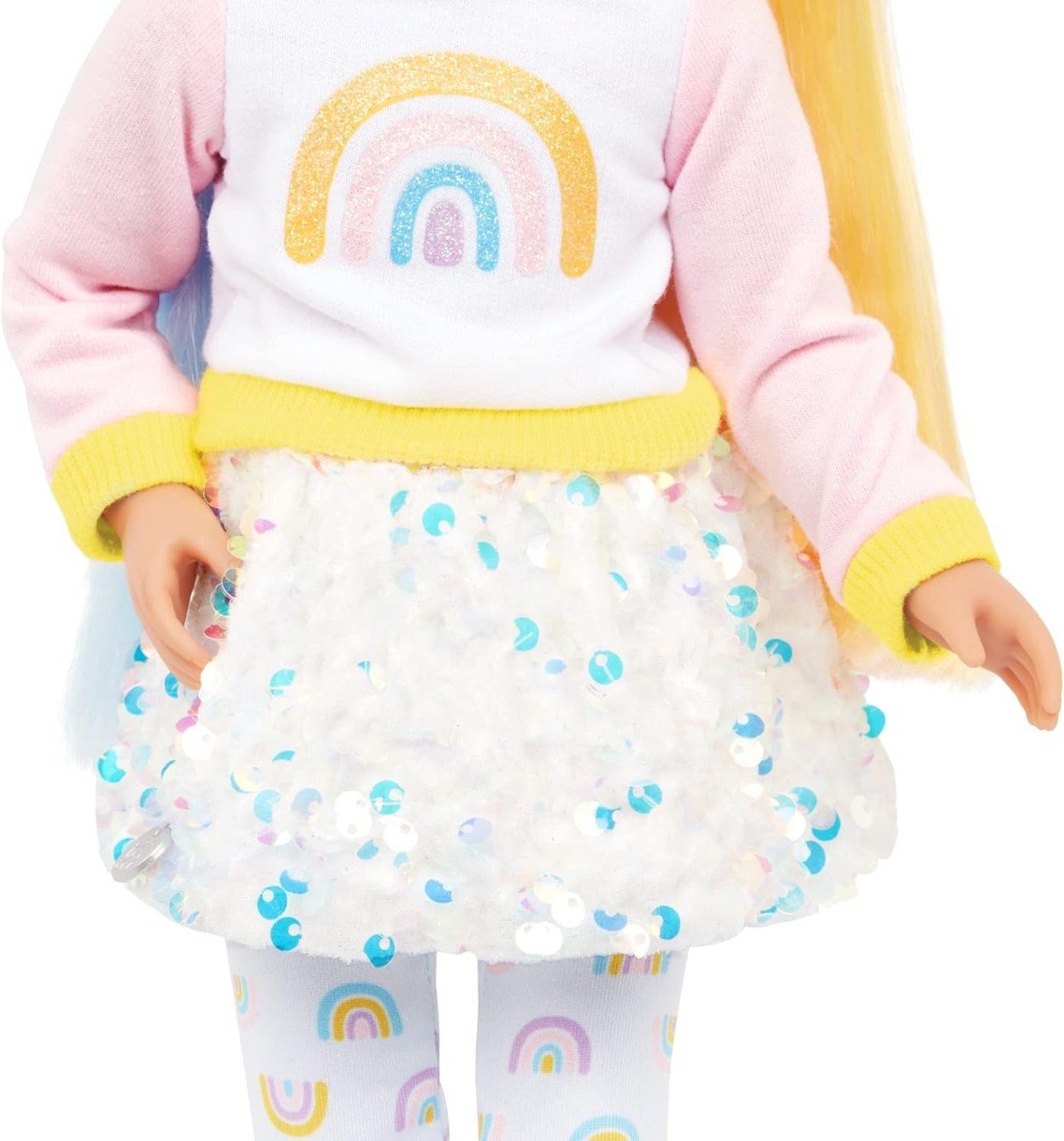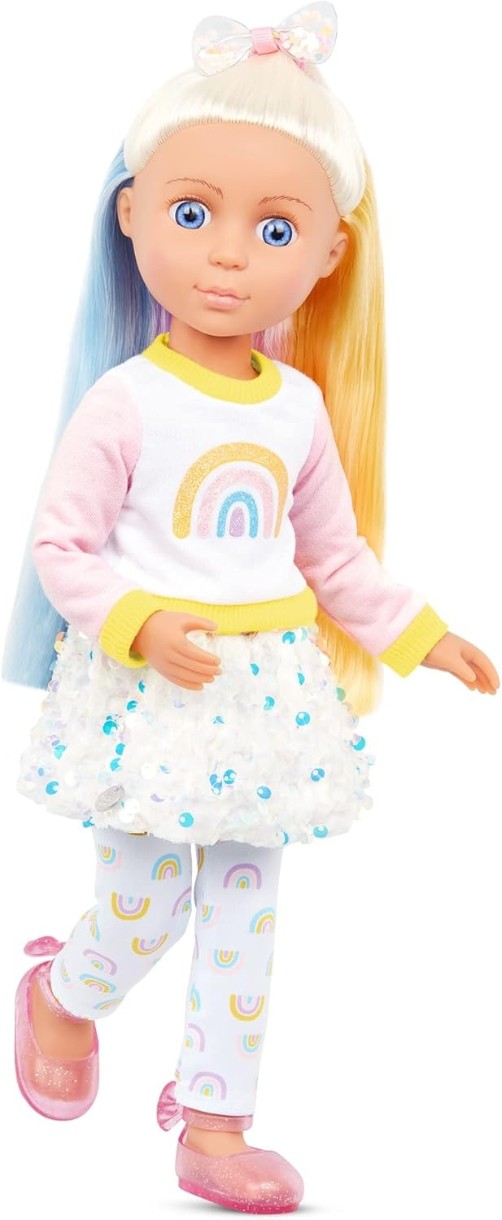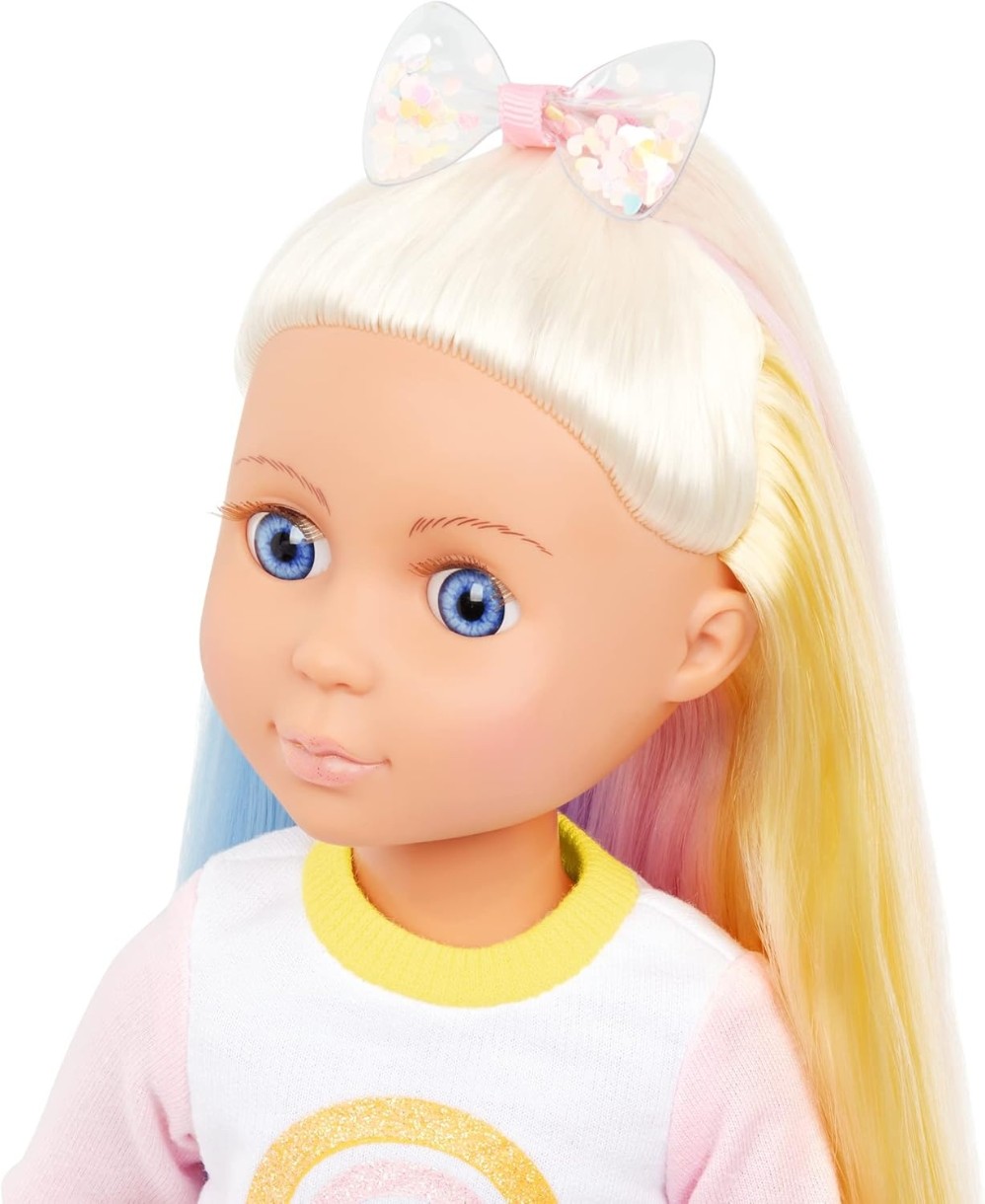 Faceți cunoștință cu Laica: Are ochi albaștri strălucitori cu gene moi și părul lung în nuanțe strălucitoare de curcubeu, care este distractiv de periat și coafat! Laica vine cu un hanorac curcubeu, fustă cu paiete, jambiere cu imprimeu curcubeu, bentiță pentru păr și pantofi cu sclipici.