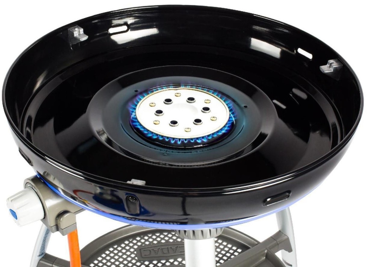 Grătarul Cadac Carri Chef 2 BBQ Plancha Dome 30mb are o tigaie din aluminiu acoperită cu ceramică pentru căldură uniformă și gătit maxim. Datorită mânerului cu dom rezistent la căldură, puteți controla cu încredere grătarul în timpul gătitului. Domul emailat din portelan cu radiator din otel inoxidabil asigura distributia optima a caldurii si o pastreaza in interiorul gratarului.
