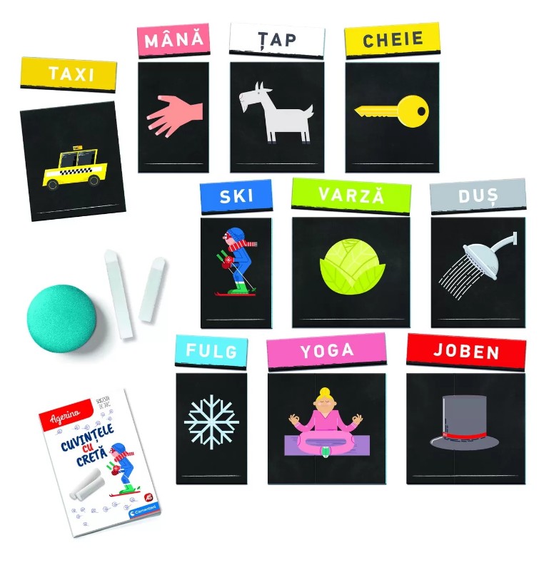 In set10 tablite negre cu imagini, 10 cartonase cu cuvinte, 2 bucati de creta, 1 burete de sters, fisa de instructiuni cu sugestii de joc