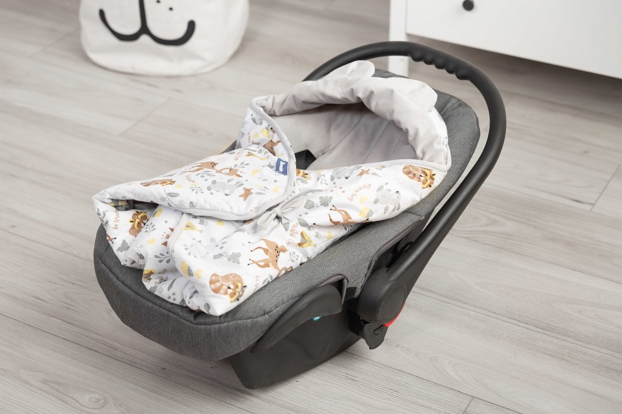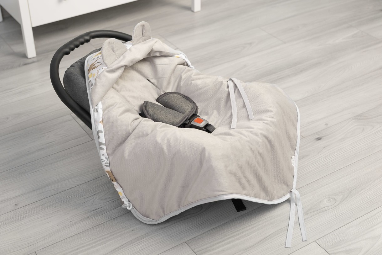 Protejeaza impotriva frigului si vantului. Are 3 straturi: bumbac colorat, izolatie antialergica si tesatura moale din catifea. Poate fi folosit si ca patura pentru carucior sau patut. Are gauri pentru centurile de siguranta in 3 puncte.