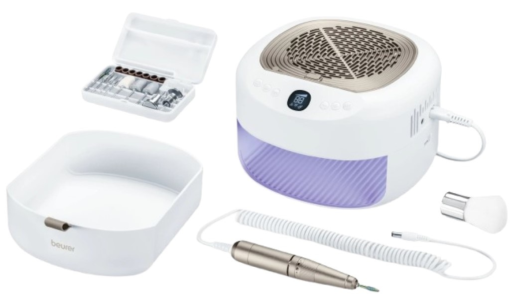 Aparatul pentru manichiură și pedichiură Beurer MP 200 StudioNails Pro este un dispozitiv performant care îmbină trei funcții esențiale: o freză pentru prelucrarea unghiilor, o lampă UV/LED și o funcție de aspirație a prafului de unghii. Datorită acestei combinații, este ideal pentru aplicarea straturilor modelatoare din acril și gel, precum și a lacurilor UV, oferind o îngrijire rapidă și profesională a unghiilor – ca într-un salon de manichiură.