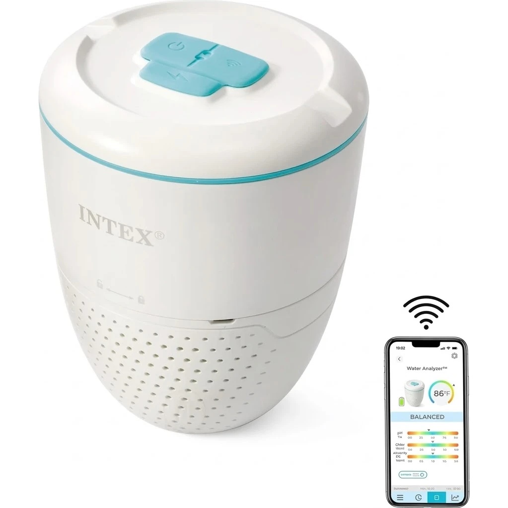 Analizatorul de apă Intex 28607 monitorizează automat calitatea apei din piscină și ajută la menținerea acesteia curată și sigură, fără verificări manuale constante. Dispozitivul măsoară nivelul pH-ului și ORP (potențialul de oxidare-reducere, care reflectă eficiența clorinării) la fiecare oră și transmite datele către aplicația mobilă Intex Link App.