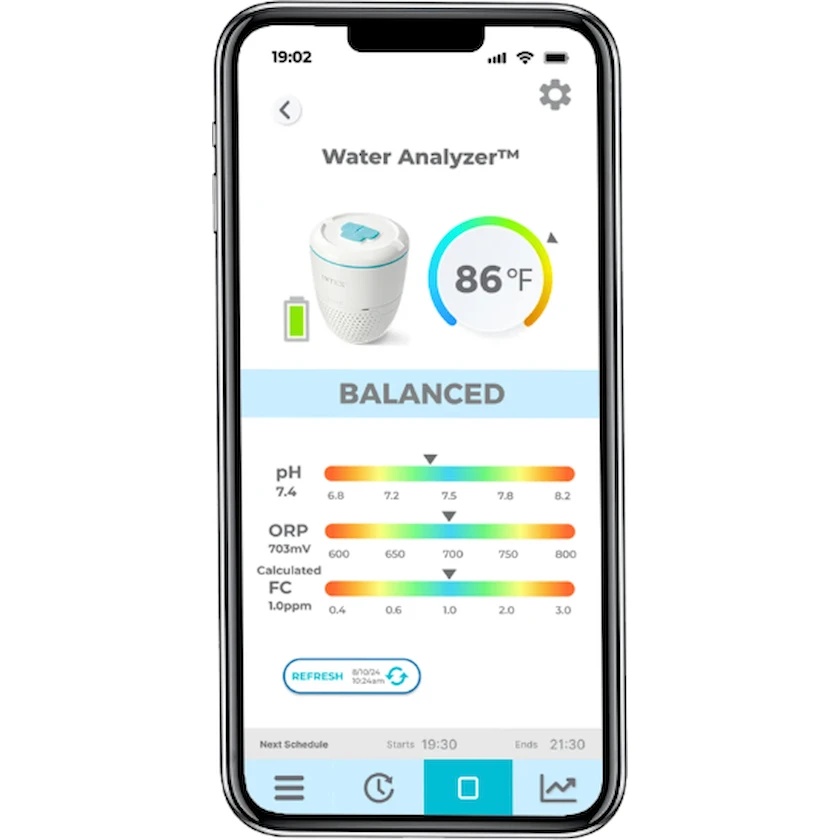 În aplicație sunt afișate valorile actuale ale apei, rapoarte și recomandări pentru ajustarea echilibrului chimic. Dacă parametrii ies din limitele normale, dispozitivul trimite notificări cu instrucțiuni pentru corectarea acestora.