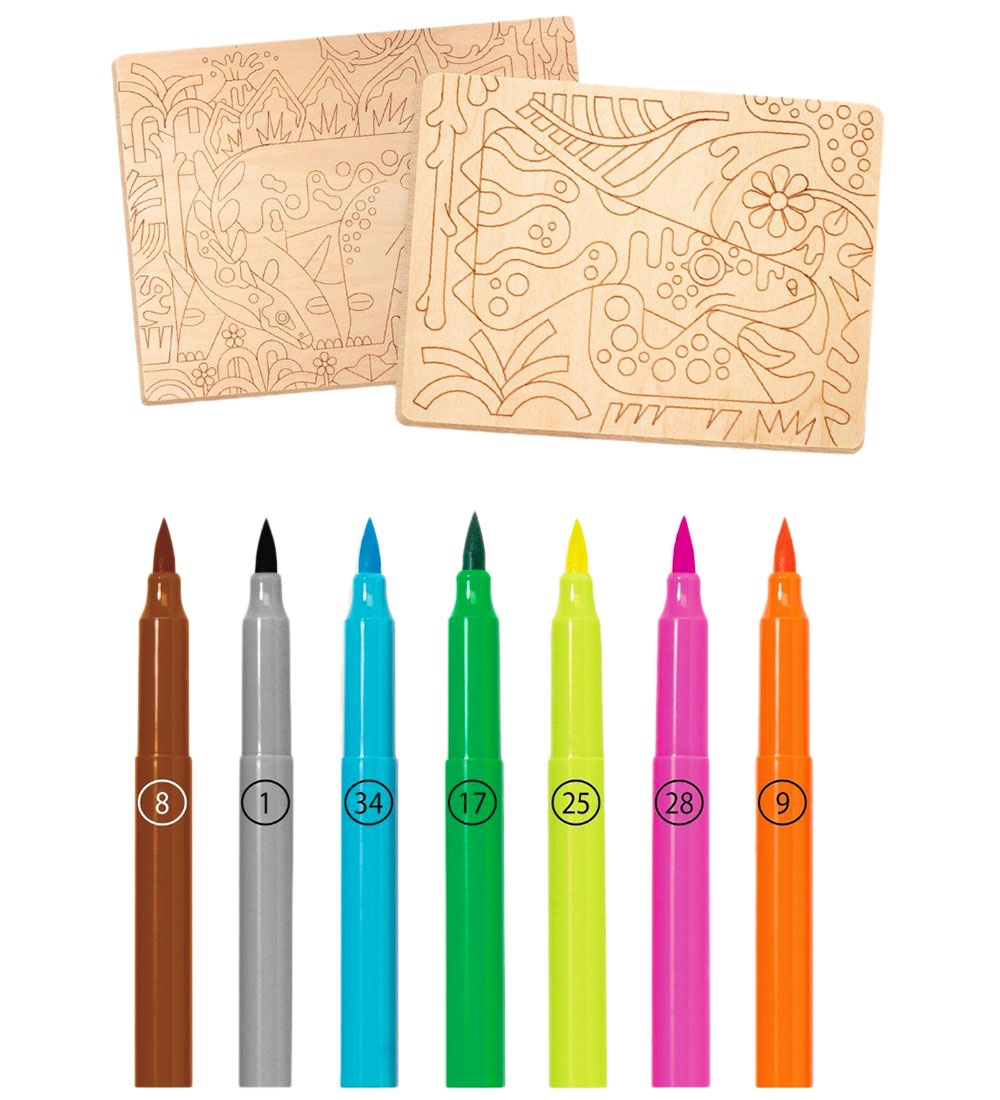 In set3 plăci de lemn, 7 markere, 1 foaie de probă 1 broșură cu sugestii de colorat