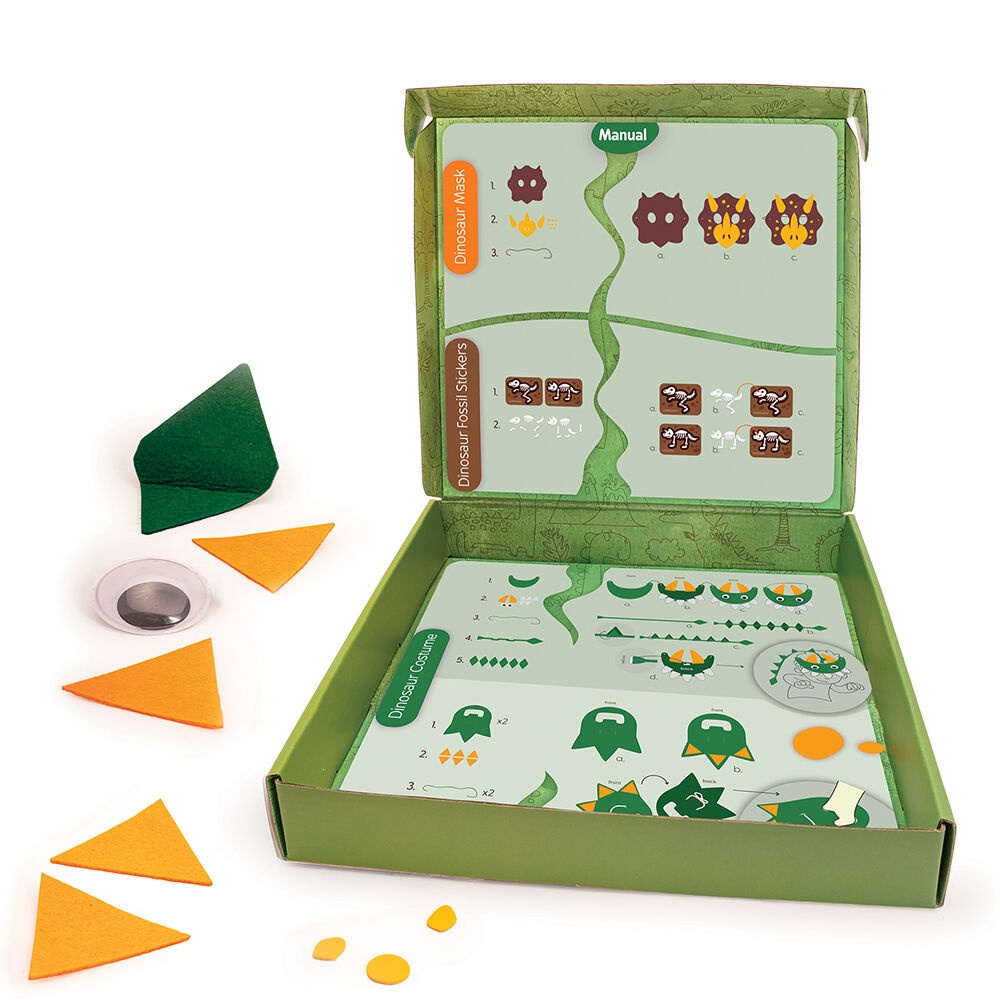 Creează-ți propriile obiecte meșteșugărești și trăiește în epoca dinozaurilor. Costum cu pălărie, coadă și picioare de dinozaur și stickere cu fosile de dinozaur, special confecționat din materiale sigure și moi pentru joaca creativă a copiilor.