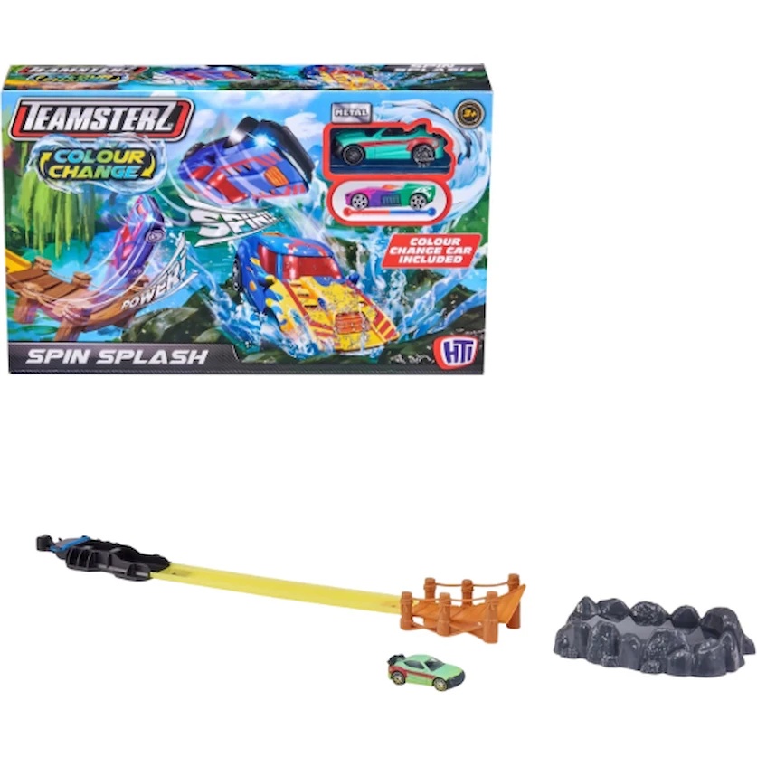Micul șofer va avea distracție nesfârșită cu circuitul Teamsterz Colour Change Spin Splash! Lansează mașinuța pe pistă cu ajutorul catapultei elastice și urmărește cum sare în „piscina de stâncă” cu apă caldă, unde își schimbă culoarea. Apoi scufund-o în apa rece cu gheață pentru a reveni la nuanța inițială. Setul include o mașinuță metalică cu funcție de schimbare a culorii, un lansator, 30 cm de pistă, o rampă și două piscine pentru apă. Ușor de asamblat și compatibil cu alte seturi și mașinuțe die-cast de 3″. Perfect pentru a stimula imaginația, abilitățile motrice fine și joaca creativă.