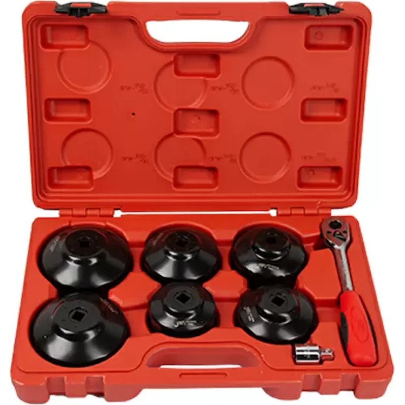 Set de extractoare pentru filtre de ulei cu un interval de prindere de la 65 la 93 mm și cheie cu clichet reversibil de 3/8''-1/2'' este destinat întreținerii și înlocuirii filtrelor de ulei în automobile. Setul include adaptoare pentru a lucra cu filtre de diferite diametre, ceea ce îl face un instrument versatil pentru mecanicii auto și pasionații de automobile. Cheia cu clichet reversibil asigură confort în utilizare și posibilitatea de a lucra în ambele direcții, ceea ce simplifică semnificativ procesul de demontare și montare a filtrelor.
