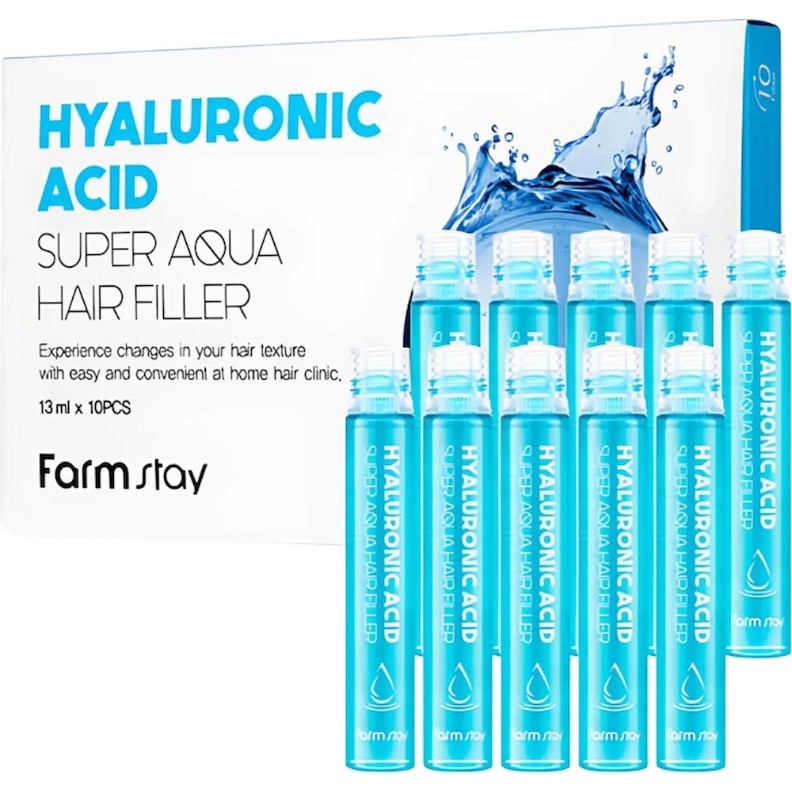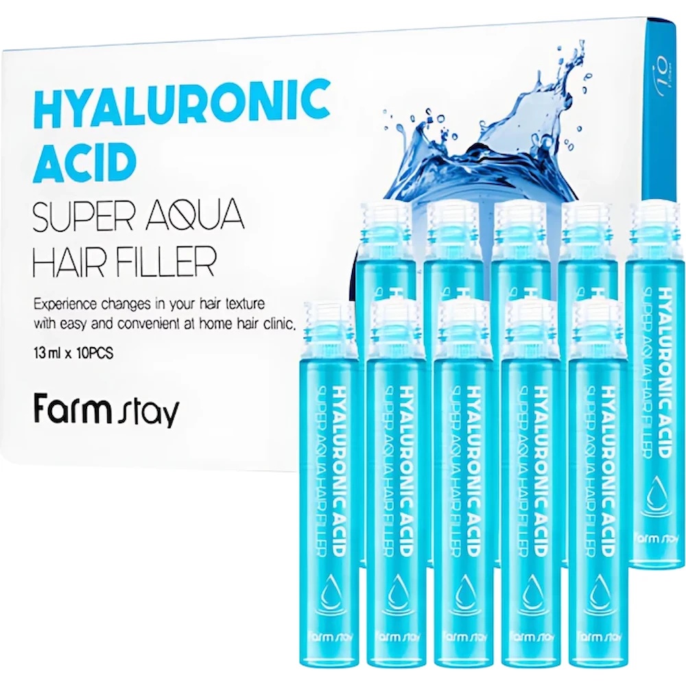 Filler pentru păr FarmStay Hyaluronic Acid Aqua Ampoule 13 ml × 10 buc — tratament intensiv în fiole pentru hidratarea profundă și repararea părului uscat, deteriorat și deshidratat.