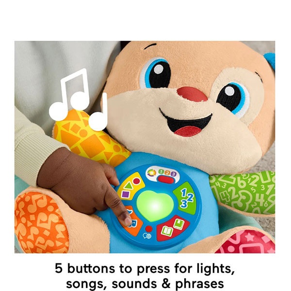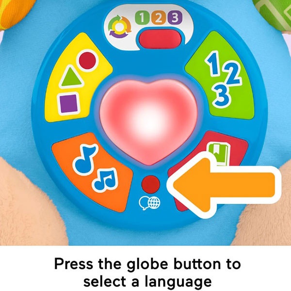Apăsând cele 5 butoane de pe burtica cățelușului, copilul va vedea cum inimioara lui se aprinde în culori diferite, în timp ce redă peste 80 de cântece, sunete și expresii.