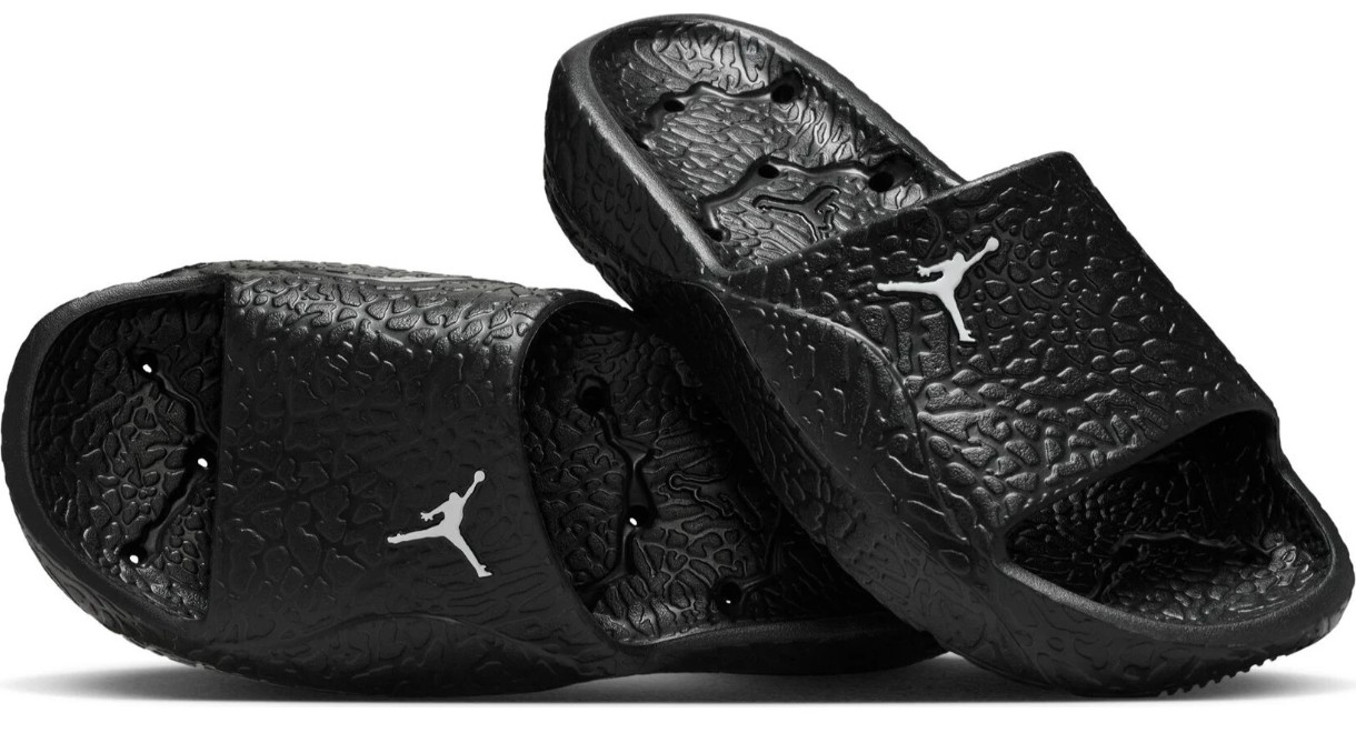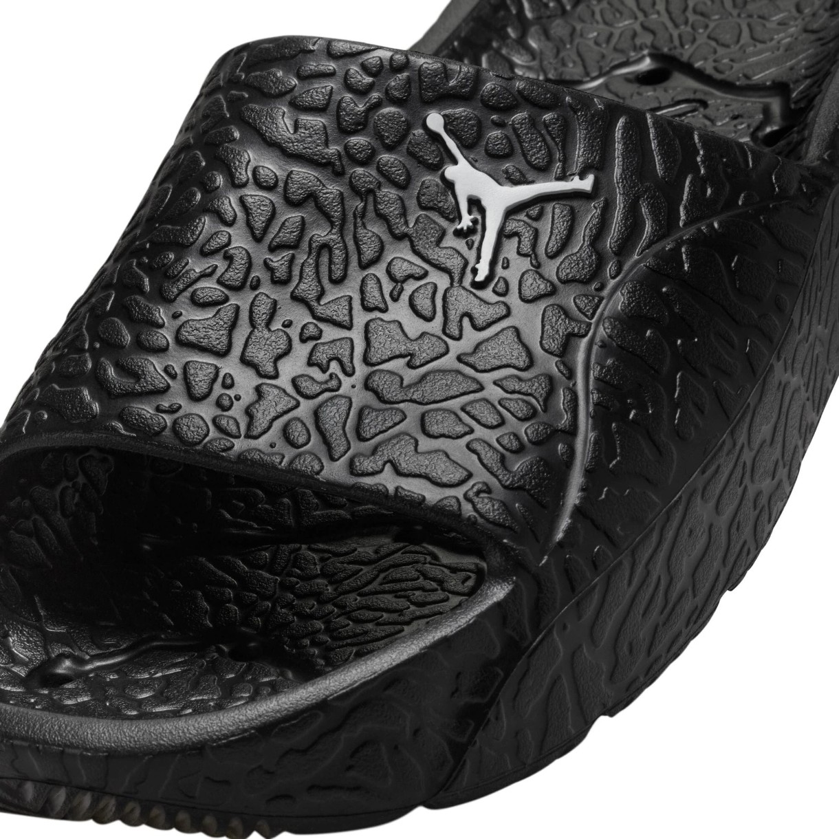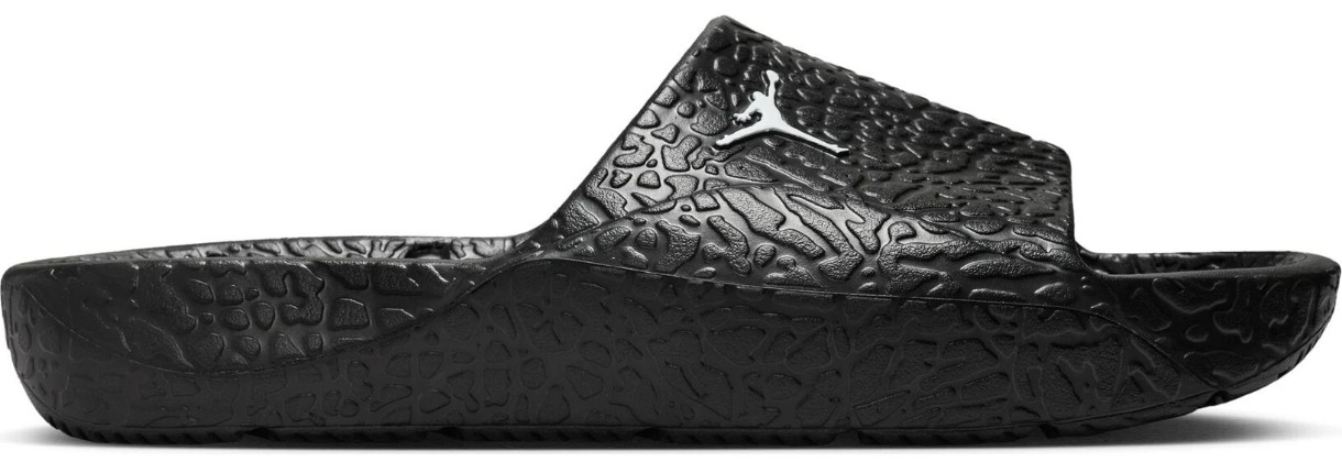 Talpa anatomică curbată susține ușor piciorul, creând o senzație de stabilitate. Printul reliefat Elephant de pe tălpică îmbunătățește aderența și adaugă un accent caracteristic în stilul Jordan. Orificiile de drenaj de-a lungul tălpii facilitează evacuarea rapidă a apei, iar modelul de profil „brad” sporește aderența pe suprafețe umede. Brandingul Jumpman completează designul cu o notă de recunoaștere.