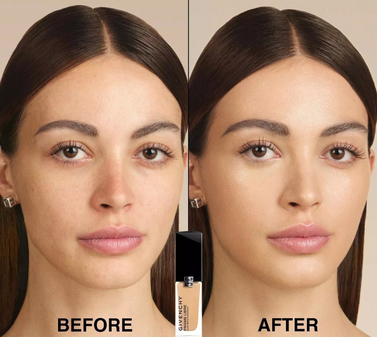 Fondul de ten-serum Givenchy Glow Serum Foundation, parte din colecția iconică Prisme Libre, creează o bază luminoasă cu efect de soft focus, care rezistă până la 24 de ore. Acest fluid lejer este potrivit pentru toate tipurile de piele și oferă o acoperire medie, ce poate fi intensificată după preferință.
