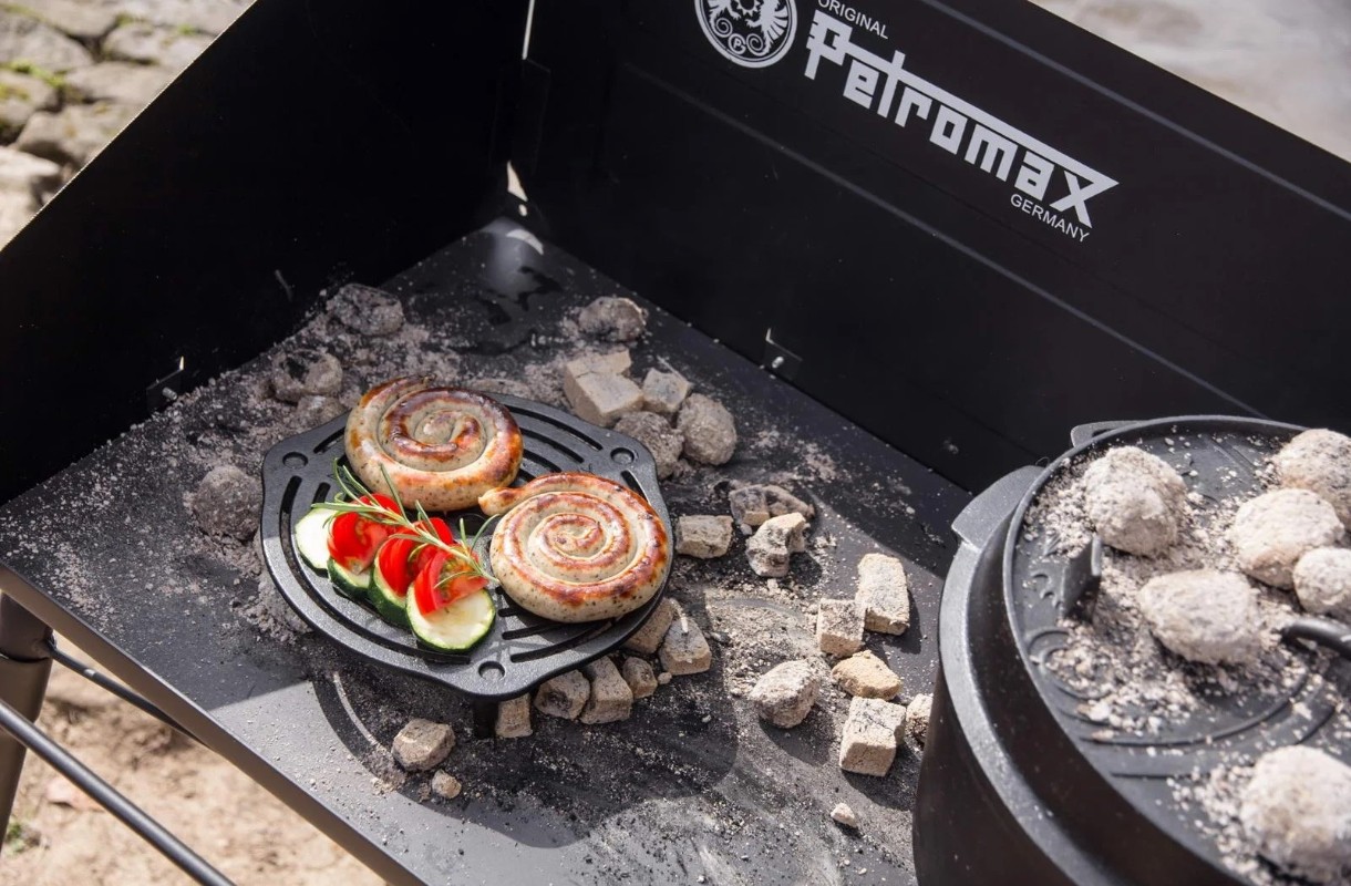 Grilă Petromax Cast-iron Stack Grate fabricat din fontă solidă asigură o distribuție de primă clasă a căldurii — exact ceea ce aveți nevoie pentru coacerea, fierberea și gătirea la aburi pe mai multe niveluri într-un cuptor olandez. Carnea, legumele și prăjiturile ies bine și nu se lipesc, deoarece aparatul stă pe trei picioare care mențin o distanță perfectă față de fundul tigăii.