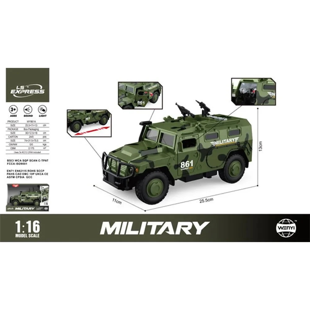 Mașina blindată militară este o jucărie impresionantă, inspirată din vehiculele tactice reale, concepută pentru copiii pasionați de jocurile de acțiune și misiuni militare. Modelul la scară 1:16 oferă detalii autentice, caroserie robustă și roți mari, potrivite pentru joc activ atât în interior, cât și în exterior.