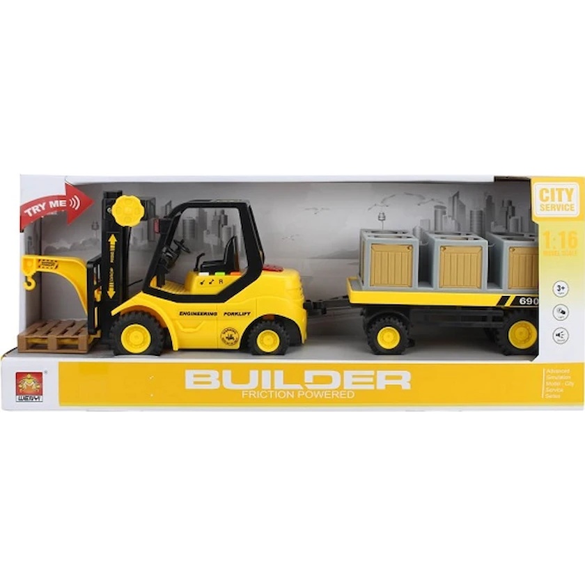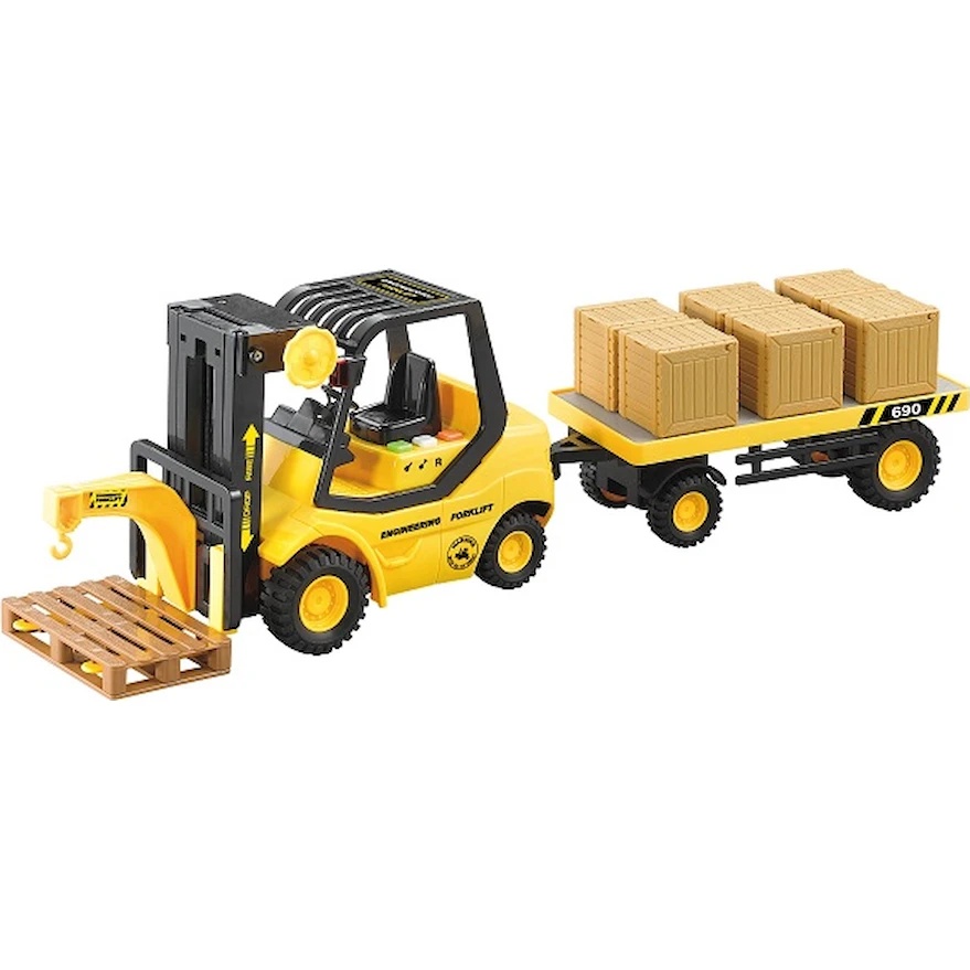 Stivuitorul cu remorcă este o jucărie realistă și interactivă, concepută pentru copiii pasionați de vehicule utilitare și activități de încărcare și transport. Realizat la scară 1:16, modelul impresionează prin designul robust, culoarea vizibilă și detaliile atent finisate, precum brațul de ridicare, furcile frontale, remorca detașabilă și lăzile de marfă incluse.