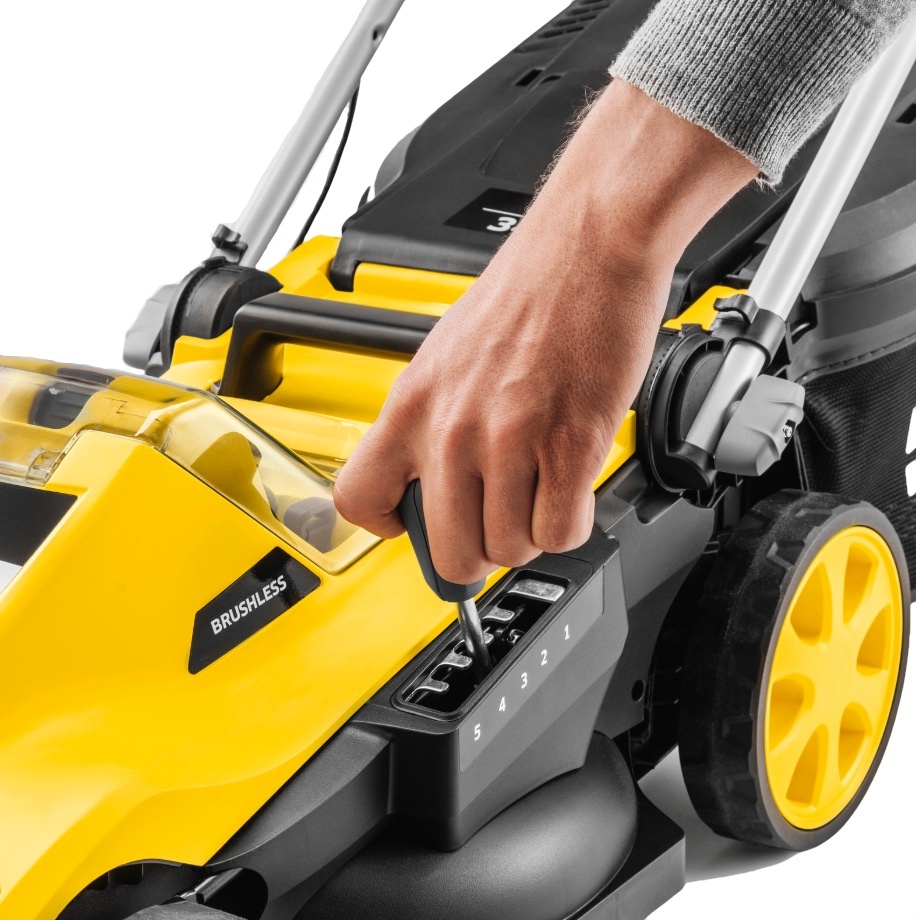 Mașina de tuns iarba cu acumulator de 18 volți, ușoară și echipată cu un motor electric puternic fără perii, se remarcă prin manevrabilitate ridicată și permite o tundere rapidă și precisă a gazonului pe suprafețe de până la 350 m². Lățimea de lucru este de 34 cm, iar înălțimea de tăiere poate fi reglată în 5 trepte, între 25 și 60 mm. Sistemul inteligent de gestionare a motorului iPower adaptează automat turația lamei în funcție de caracteristicile ierbii. Pieptenii laterali asigură captarea optimă a firelor de iarbă la marginea gazonului. Sistemul de tundere „2 în 1” permite fie distribuirea uniformă a ierbii tăiate pe gazon ca îngrășământ natural (funcție de mulcire), fie colectarea acesteia într-un coș colector spațios de 35 litri, care garantează lucru continuu fără întreruperi. Mânerul de ghidare este reglabil pe înălțime pentru o poziție de lucru confortabilă, iar designul pliabil economisește spațiu la depozitare. Mânerele integrate facilitează transportul pe scări și trepte. Setul include acumulatorul și încărcătorul rapid.