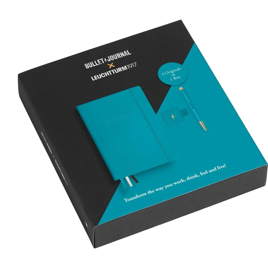 Setul de colecție Bullet Journal® în culoarea Turquoise25 este un set cadou exclusiv, care reunește trei produse originale dezvoltate împreună cu Ryder Carroll, creatorul metodei Bullet Journal®. Setul include caietul oficial Bullet Journal® Edition 2, un pix Drehgriffel Nr. 1 cu rezervă cu gel turcoaz și suportul autoadeziv pentru pix Pen Loop, în culoarea asortată Turquoise25. Trei instrumente emblematice, perfect coordonate, prezentate într-o cutie elegantă, ediție limitată.