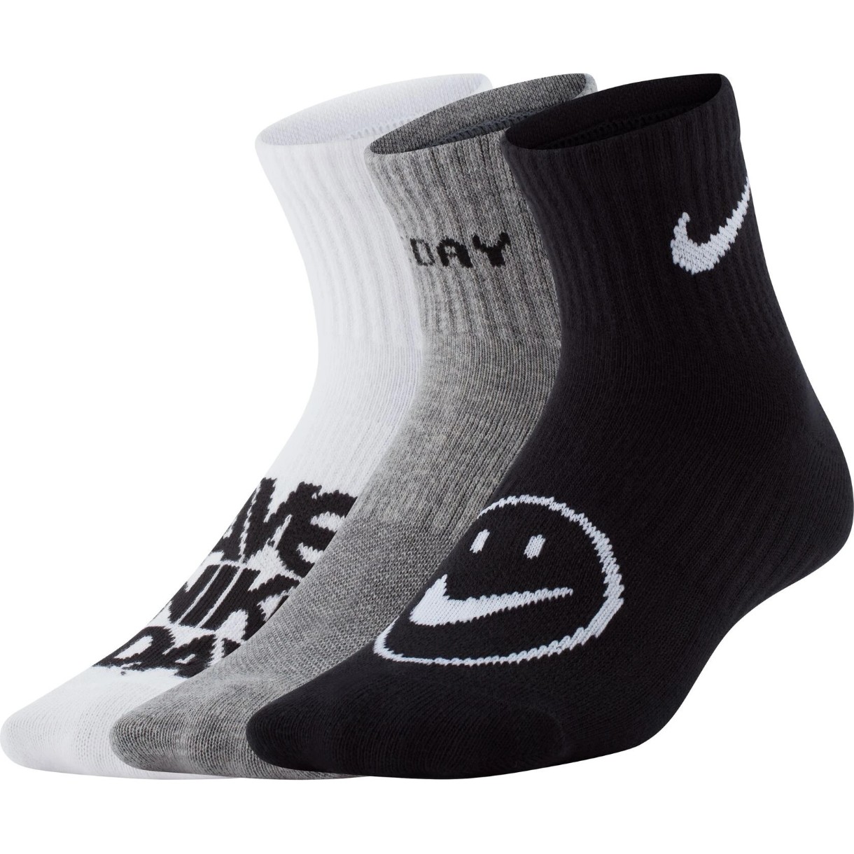 Setul de 3 perechi adaugă un plus de practicitate pentru utilizarea zilnică, permițând schimbarea ușoară și având mereu la îndemână o pereche proaspătă pentru o zi activă. Brandingul distinctiv, cu logo Nike Swoosh, elementul grafic Smile și inscripția „Have a Nike Day”, adaugă un caracter jucăuș și evidențiază spiritul colecției.