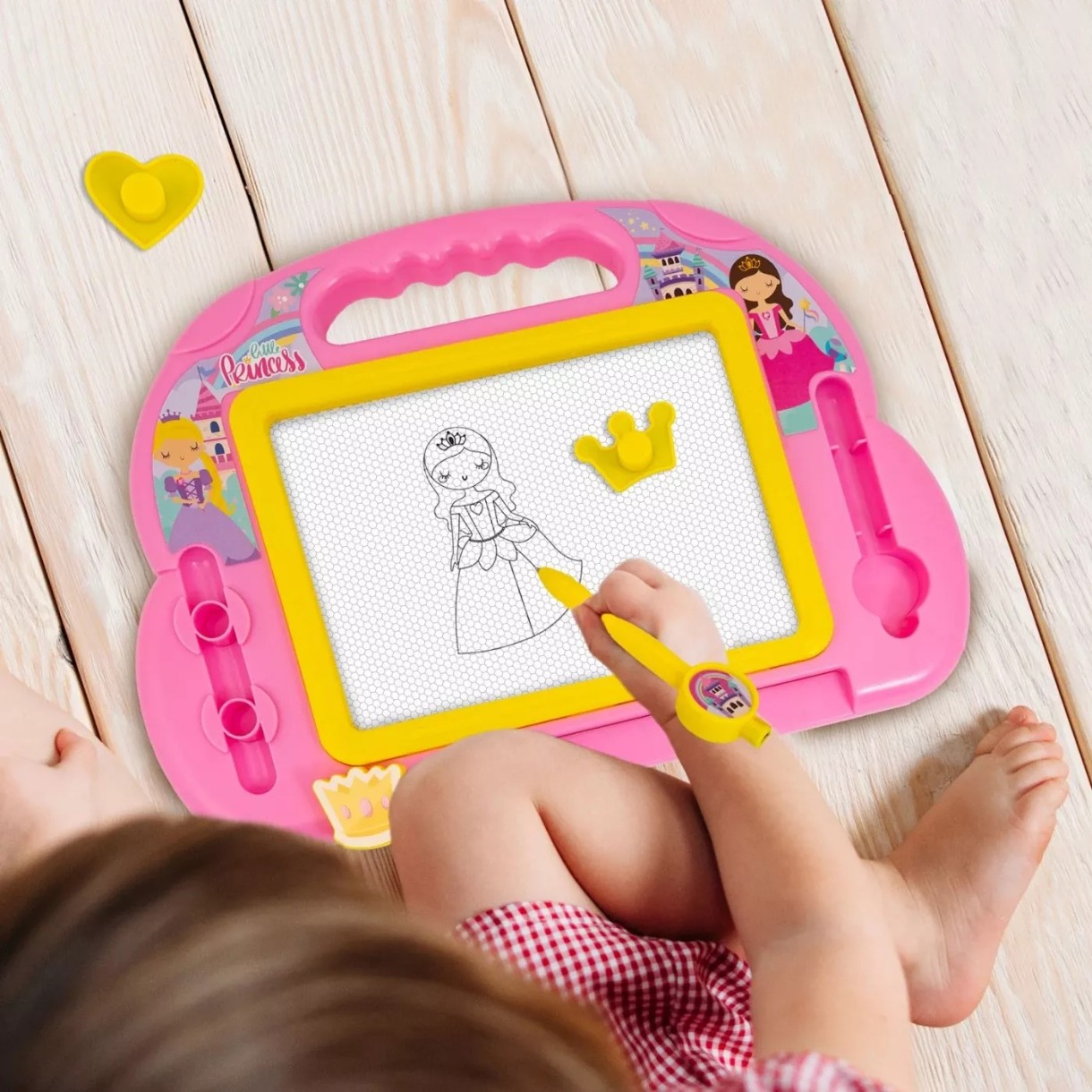 O tablă, un buton magic de ștergere și nenumărate opțiuni de desen. Copiii își pot desena propria poză cu stiloul furnizat. Când mută butonul situat sub panou la dreapta și la stânga, ei șterg imaginea și încep o nouă. desenează și șterge cu prințesele lor preferate!