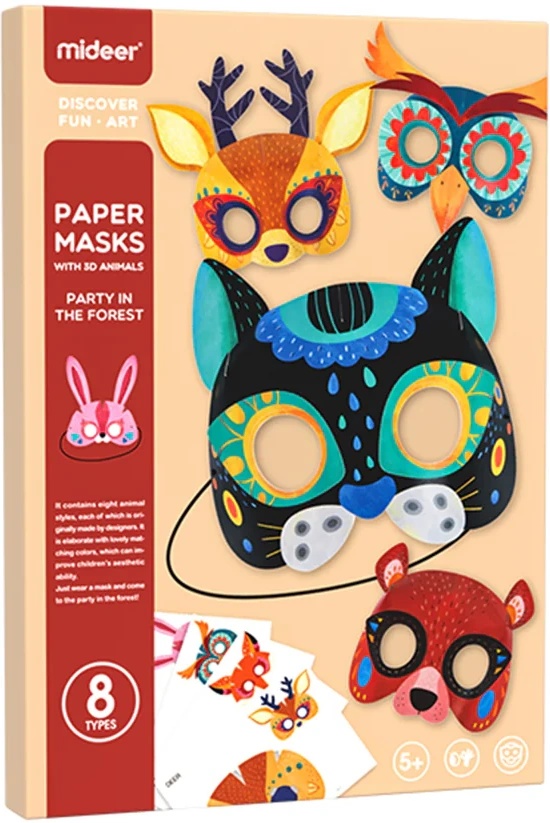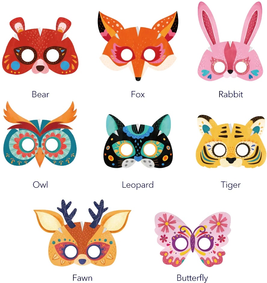 . Setul include măști cu personaje inspirate din lumea pădurii, pe care cei mici le pot