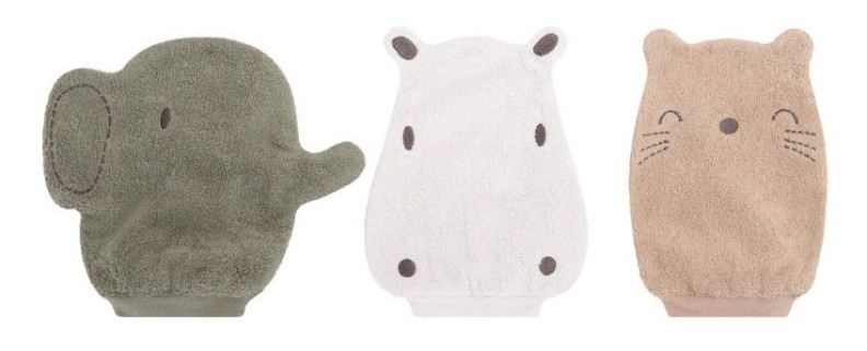 Descoperiți setul nostru de 3 mănuși de baie cu animale din bumbac moale.
