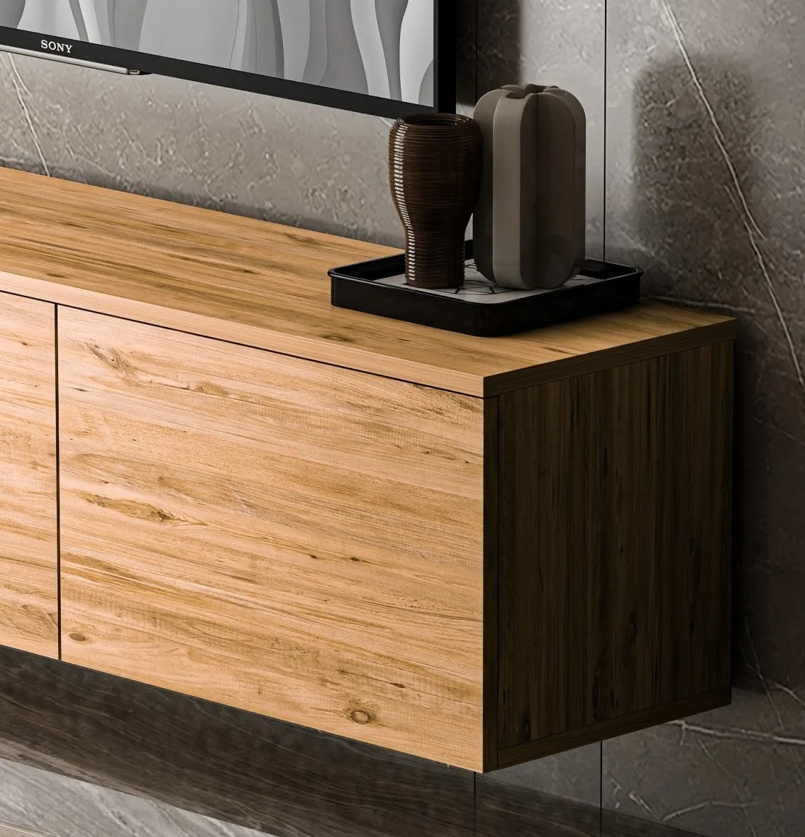 Suportul pentru televizor poate fi fixat cu ușurință pe perete, oferind un plus de stabilitate și siguranță. Indiferent dacă aveți un apartament mic sau o cameră de zi spațioasă, acest suport versatil se adaptează nevoilor dvs. Dimensiunile compacte de 160 cm lățime, 35 cm înălțime și 32 cm adâncime îl fac potrivit pentru orice spațiu.