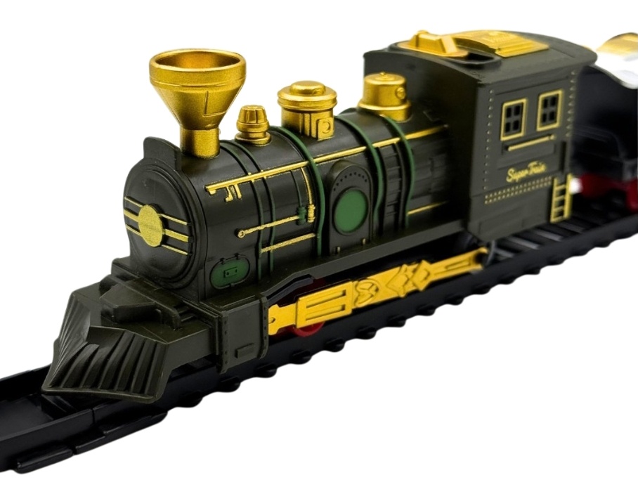 Setul este format din 3 vagoane, sine, realizate cu precizie si frumos finisate, care pot fi aranjate dupa propria imaginatie. Mai mult, trenul emite sunete ceea ce ii ofera si mai mult farmec.
