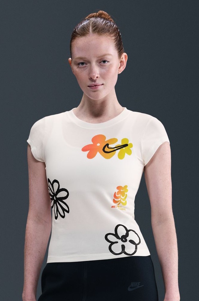 Imprimeul floral viu colorat de pe piept adaugă imaginii un accent jucăuș și proaspăt, amintind de zilele de vară și de lejeritatea sezonului cald. O notă stilată finală este dată de logo-ul conturat Nike Swoosh, care vă va evidenția admirația față de brandul cult.