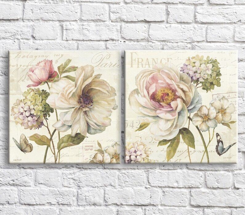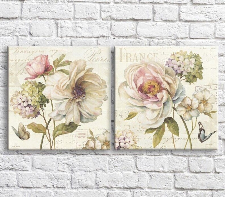 Pictură ArtPoster Bouquet of White wildflowers on a background of text, background Beige, diptych (3467696)