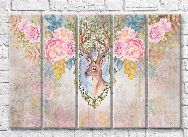 Pictură Rainbow Deer on a vintage background of roses (3551888)