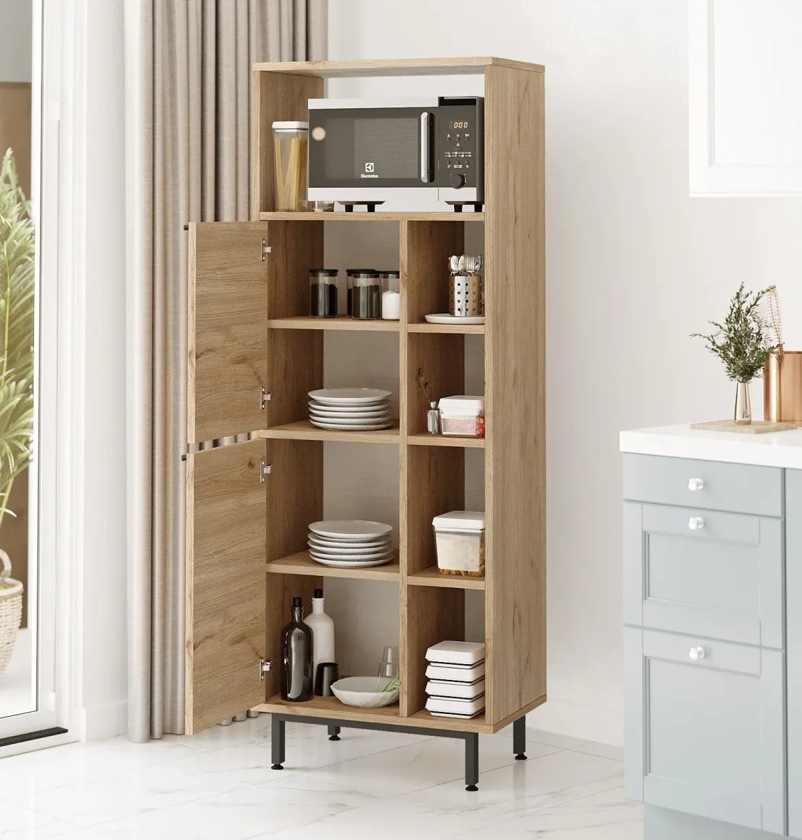 Interiorul spațios ajută la menținerea ordinii și organizării. Dulapul oferă suficient spațiu pentru vase, ustensile și aparate, asigurând acces facil ori de câte ori este necesar.