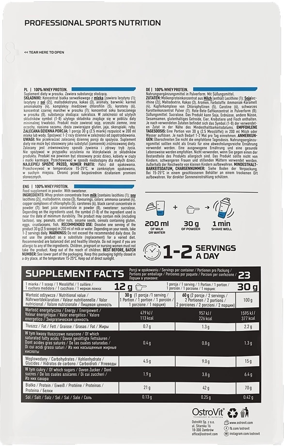 OstroVit 100% WHEY PROTEIN este un supliment proteic de înaltă calitate, conținând 70% proteine. Acest supliment alimentar este potrivit pentru toți sportivii, indiferent de disciplina practicată. Este recomandat în special în perioadele de creștere a masei musculare și de reducere a țesutului adipos. Poate fi folosit atât în timpul antrenamentelor avansate, cât și ca ingredient în alimentația zilnică pentru a crește valoarea nutrițională a dietei.
