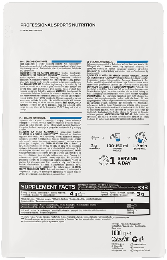 Produsul OstroVit conține monohidrat de creatină, adică o moleculă de creatină legată de o moleculă de apă – deoarece creatina este un compus hidrofil, se combină ușor cu apa, având o biodisponibilitate excelentă. Monohidratul de creatină este forma structurală cea mai simplă și, totodată, cea mai populară în rândul sportivilor. Este ideal atât pentru începători, cât și pentru sportivii profesioniști, deoarece creatina contribuie la creșterea performanței fizice în timpul exercițiilor scurte, intense și repetate – efectul benefic se obține printr-un consum zilnic de 3 g de creatină.