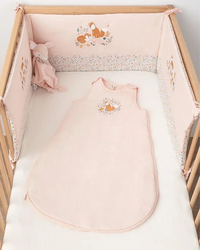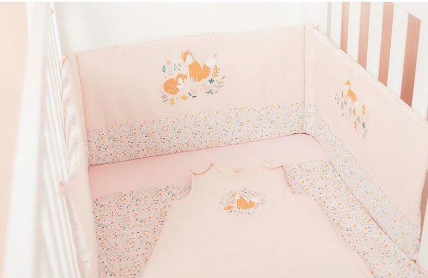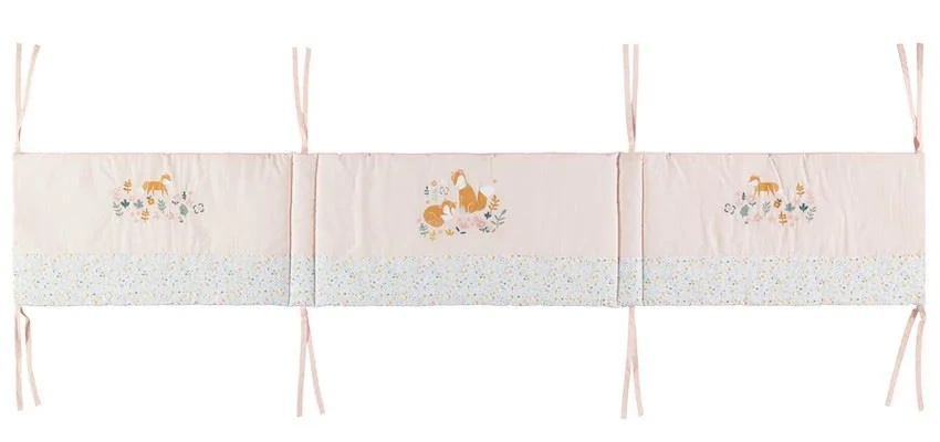 Pentru un pat bine protejat și în siguranță, aceasta protectie laterala oferă bebelușului nopți confortabile. Realizat din poplin, din 3 părți, imprimat cu flori și motive cu vulpi, are șnururi pentru a-l fixa pe barele patului.