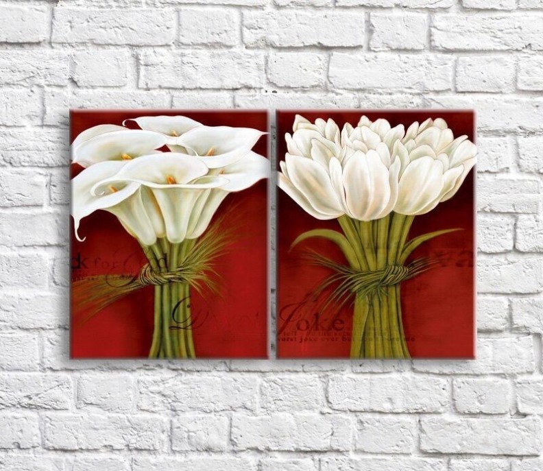 Pictură ArtPoster Bouquet of White calla lilies and tulips on a Red background with text, diptych (3467695)