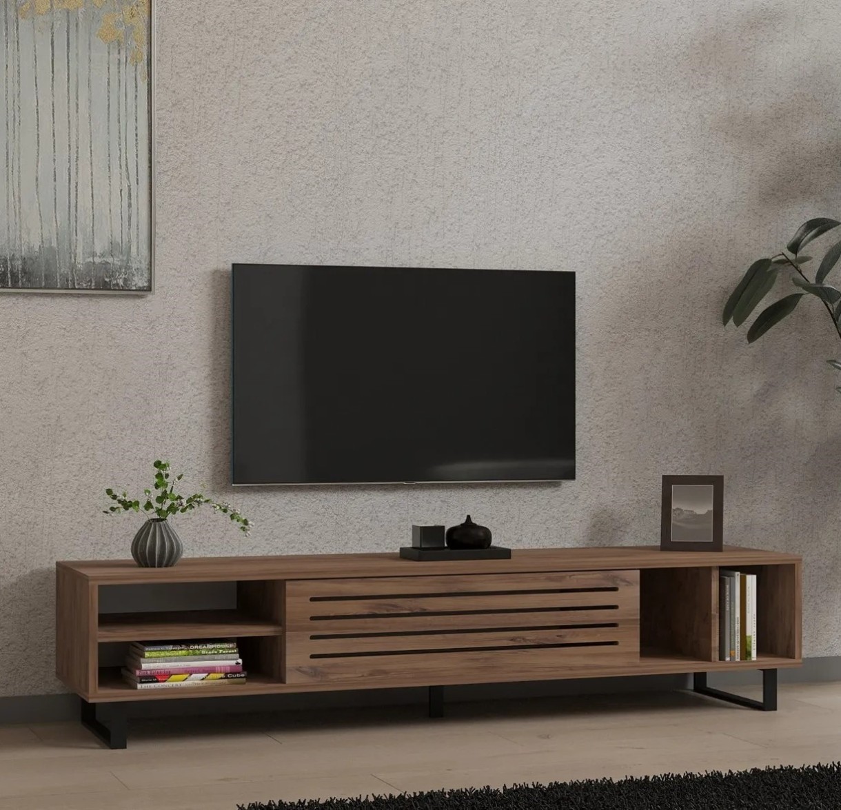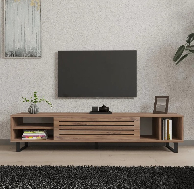Stilul industrial al suportului adaugă eleganță modernă oricărei încăperi. Liniile curate creează un punct focal vizual atrăgător, integrându-se armonios în decor. Indiferent dacă interiorul este contemporan, rustic sau eclectic, suportul TV se va potrivi perfect.