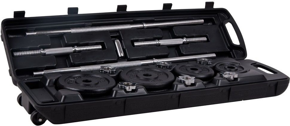 Setul de Gantere și Haltere cu Valiză inSPORTline 50 kg include două bare pentru gantere, o bară pentru haltere, 14 discuri de greutate și siguranțe. Discurile de greutate cuprinse între 1,25 — 5 kg sunt confecționate din oțel rezistent, cu acoperire specială zgârietură și rezistentă la coroziune. Barele de oțel au filete la capăt pentru prindere mai bună a siguranțelor. În acest fel, discurile de greutate se mențin ferm la locul lor, făcând mai ușor antrenamentul. Bara de 160 cm este făcută din două bucăți care pot fi ușor înșurubate între ele. Întregul set este depozitat într-o valiză din plastic cu mâner și roți de transport. Toate aceste caracteristici fac Setul de Gantere și Haltere cu Valiză inSPORTline 50 kg perfect atât pentru antrenamentele de acasă, cât și pentru exerciții fizice în timpul călătoriei.