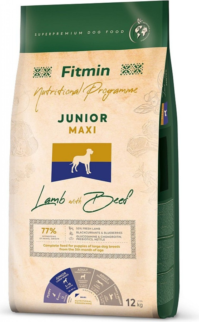 Hrană uscată pentru câini Fitmin Maxi Junior Lamb & Beef 12kg