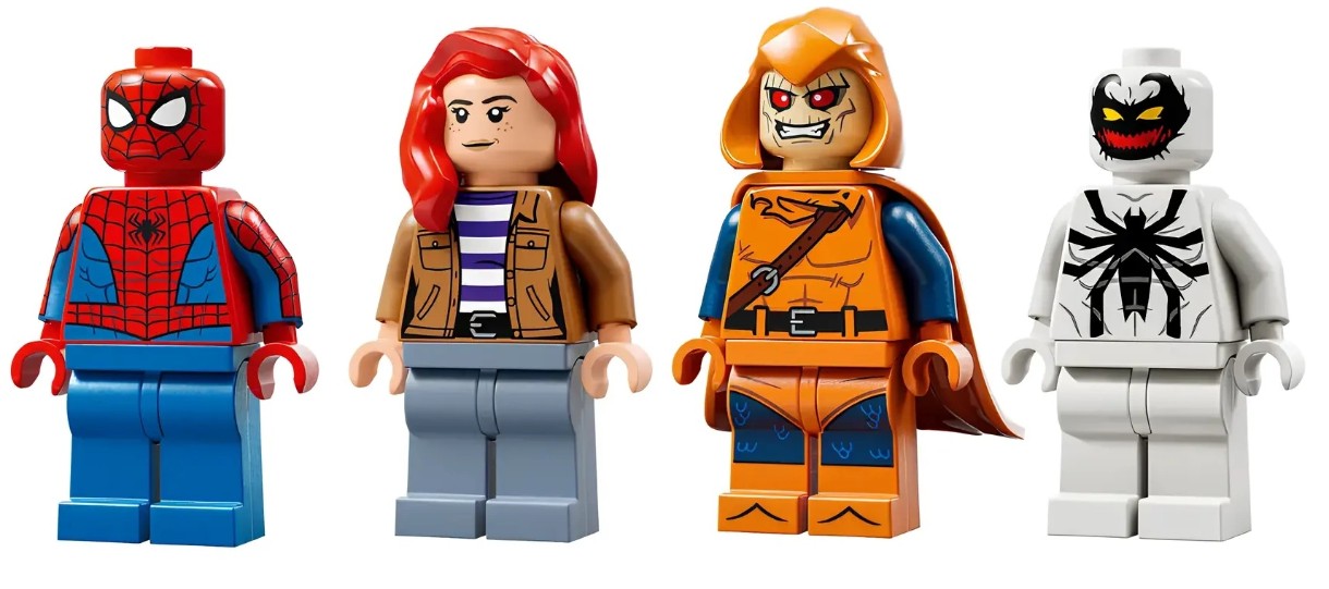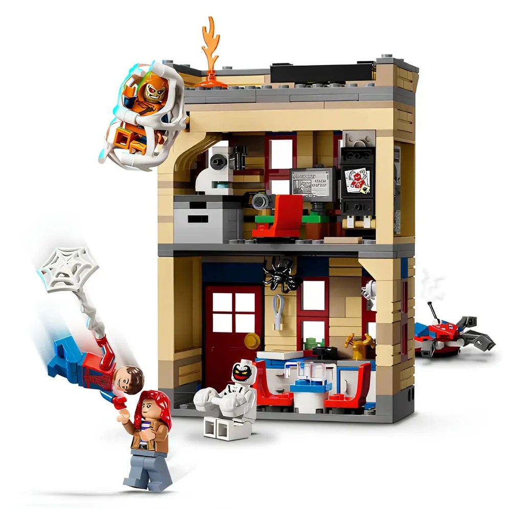 Acest set include 4 minifigurine: Hobgoblin pe planorul său dovleac-bombă; Spider-Man și pânza sa explozivă anti-venin; și Mary Jane cu robotul ei păianjen articulat. O pânză gigantică și flexibilă atașată de clădire poate prinde o minifigurină. Parterul apartamentului are o bucătărie. Primul etaj are un birou și un dormitor cu un pat pliant, birou, computer, cameră și microscop. Prin apăsarea unui buton, o parte din clădire se prăbușește. Copiii pot conecta acest set de joacă la jocul Spider-Man vs. the World. Câștigă Oscorp (76324) și adaugă-l la Spider-Verse: Miles Morales vs. The Spot (76311) pentru și mai multă distracție în joc. Conține 394 de piese.