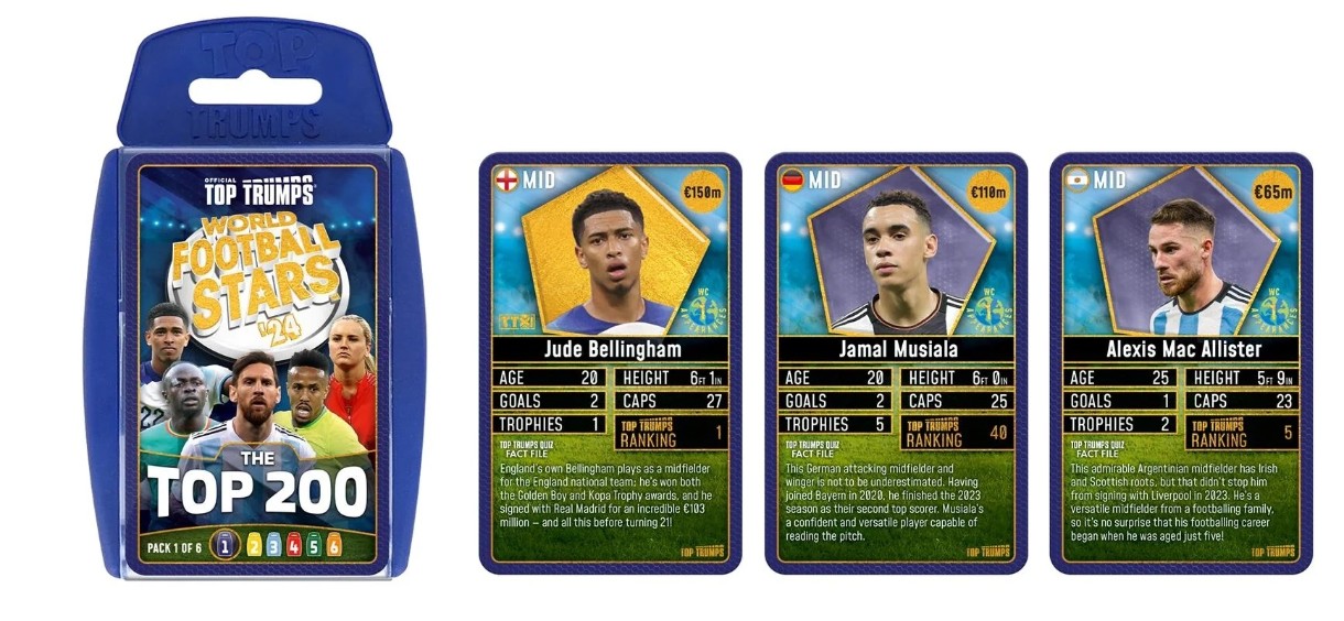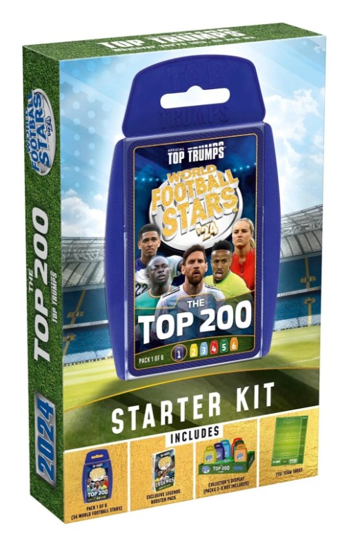 Top Trumps: World Football Stars – Top 200 Starter Kit este un joc de cărți colecționabil pentru fanii fotbalului de toate vârstele. Conține 200 de cărți cu cele mai mari vedete ale fotbalului mondial – de la legende consacrate până la talente în ascensiune. Jucătorii compară atributele fotbaliștilor (cum ar fi goluri, tehnică, vârstă) pentru a câștiga cărțile adversarului. Setul de start include un suport din plastic, regulile jocului și primul pachet de cărți.