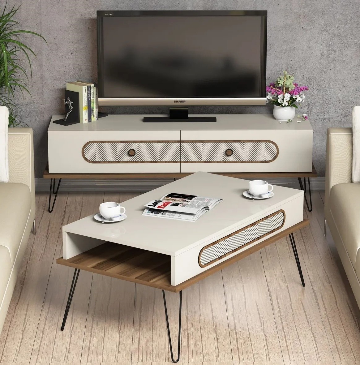 Unitatea tv dispune de numeroase rafturi, permițându-vă să organizați în mod ordonat dispozitive media, cărți și obiecte decorative. Măsuța de cafea oferă o suprafață generoasă pentru băuturi, gustări și reviste. Ambele piese pot fi fixate pe perete pentru un plus de stabilitate și siguranță.