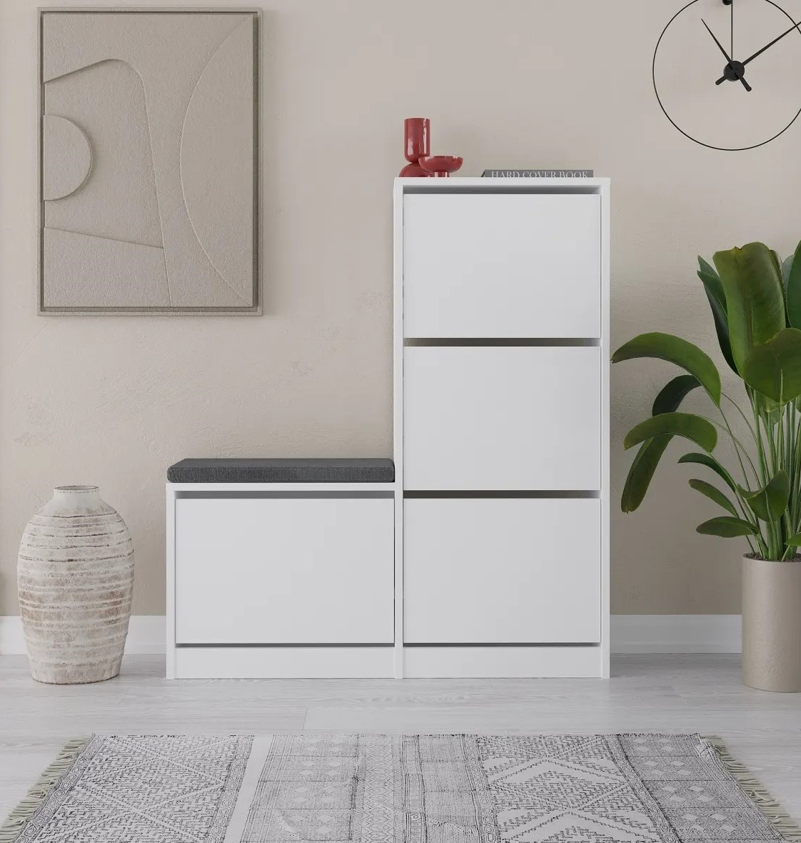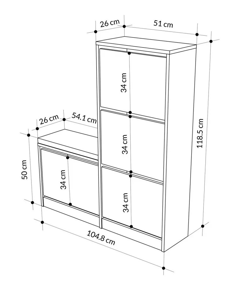 Cu dimensiunile de 105 cm lățime, 118,5 cm înălțime și 26 cm adâncime, dulapul oferă spațiu generos pentru toate perechile de pantofi. Designul inteligent include mai multe rafturi și compartimente, permițând organizarea ordonată a încălțămintei și acces facil la fiecare pereche. Găsirea pantofilor potriviți devine rapidă și ușoară.