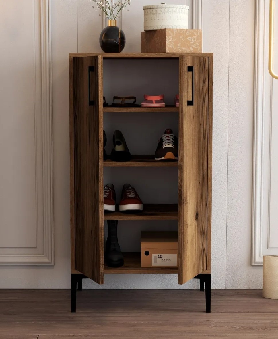 Cu o grosime de 18 mm, dulapul de pantofi este construit să reziste. Picioarele, mânerele și cuierul din metal adaugă un aspect modern și industrial, ridicând estetica spațiului. Numeroasele rafturi oferă spațiu generos pentru organizarea pantofilor și accesoriilor.