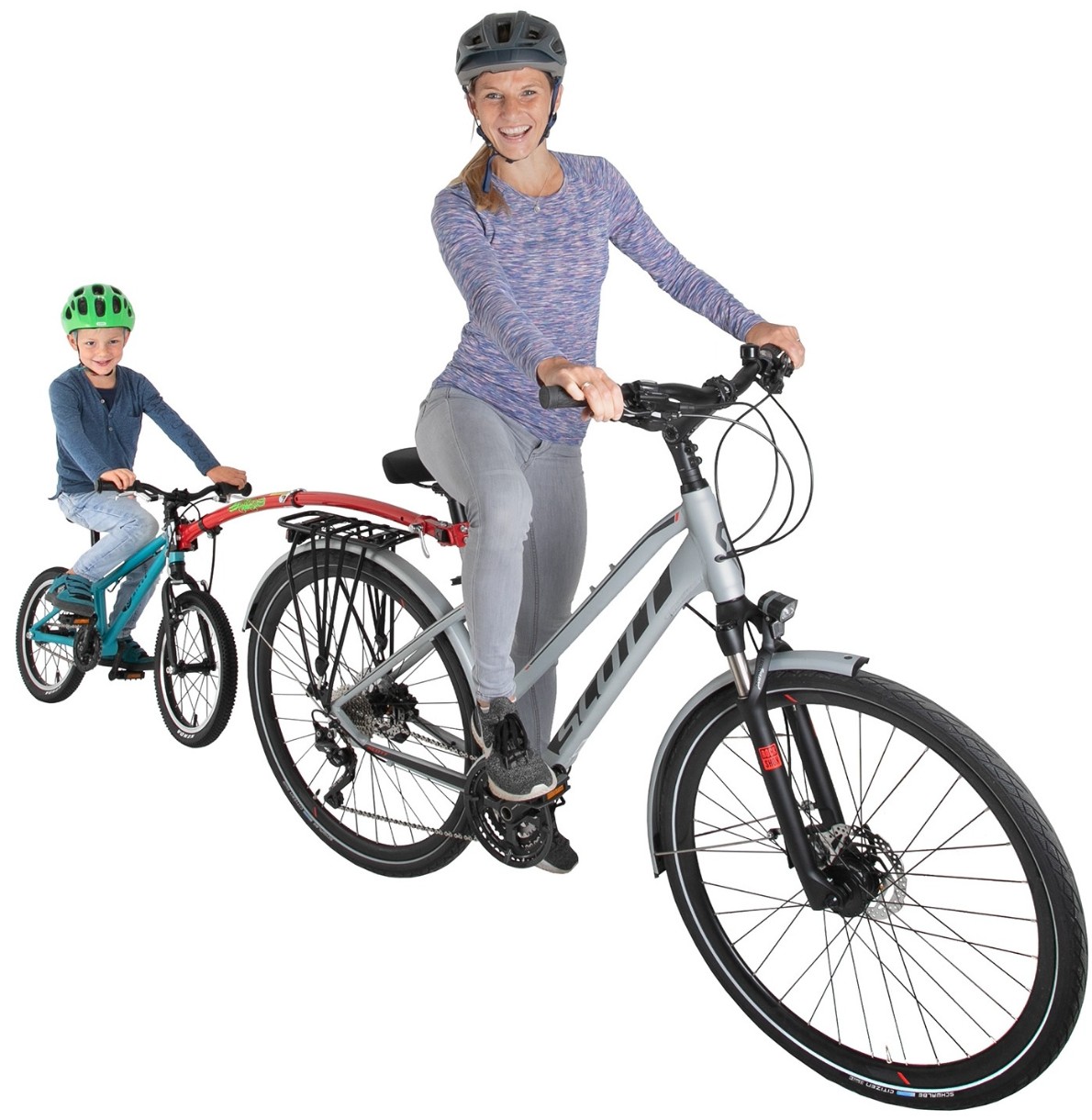 Trail-Gator Tandem Red (640025) este o bară de tractare care permite conectarea bicicletei copilului la bicicleta unui adult pentru plimbări mai sigure și mai confortabile. Sistemul ridică roata din față a bicicletei copilului și stabilizează ghidonul, astfel încât adultul controlează direcția. Construcția solidă din oțel oferă durabilitate și stabilitate în timpul mersului. Bara este pliabilă și poate fi depozitată ușor pe bicicleta adultului atunci când nu este utilizată. Este compatibilă cu majoritatea bicicletelor pentru copii cu roți de 12-20 inch și suportă o greutate de până la aproximativ 32 kg.
