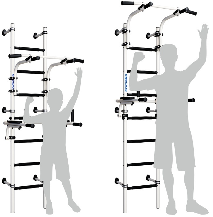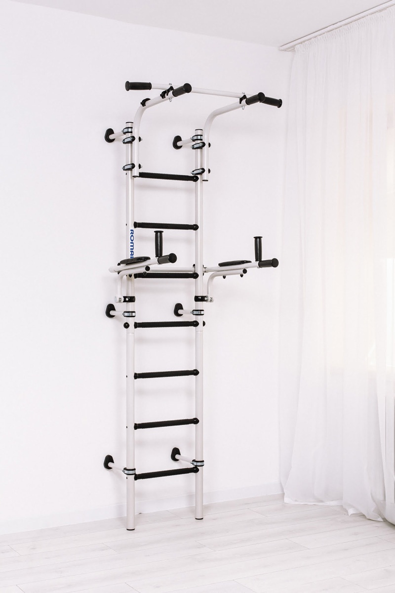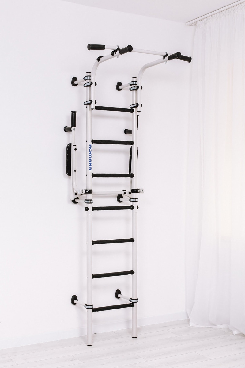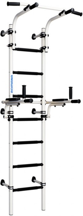 ROMANA S10 este un complex de sporturi acasa pentru intreaga familie, atat copiii cat si adultii se pot antrena pe el. Este destul de compact si nu ocupa mult spatiu: latimea treptelor este de 410 mm, aceasta este cea mai optima dimensiune pentru antrenament pe barele denivelate care vin cu trusa. Barele sunt pliabile, iar după cursuri pot fi mutate în poziție verticală. Bara orizontală poate fi mutată în înălțime și asigurată în mod convenabil pentru utilizator, folosind cleme moderne de încredere. Complexul sportiv este fixat de perete, clemele pot fi deplasate vertical pentru a evita intrarea în cabluri sau cavități.