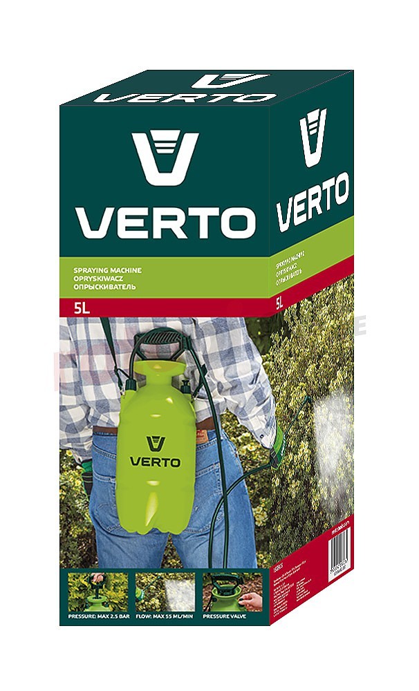 Pulverizator cu presiune VERTO. Presiune de lucru 2,5 - 3 bari. Gâtul larg facilitează umplerea buteliei. O curea suplimentară pentru suspendarea sprinklerului pe umăr și blocarea jetului mărește confortul muncii. Supapa asigură siguranța în timpul utilizării. Pulverizatorul poate fi utilizat în intervalul de temperaturi cuprins între 0 și + 45°C.