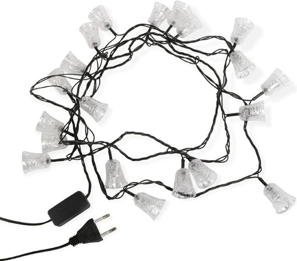 Ghirlanda cu LED-uri de 2,8 metri lungime «Clopoței» va fi un decor stilistic excelent al interiorului: un cablu întunecat cu o manta din PVC verde este aproape invizibil în decorul unui ton similar — diodele creează un efect de strălucire volumetrică. Ghirlanda este potrivită pentru a crea iluminare de accent în interior sau este utilizată ca decor independent pentru mobilier individual. 20 de LED-uri, realizate sub formă de clopote, strălucesc cu lumini multicolore, creând o atmosferă de sărbătoare și magie.