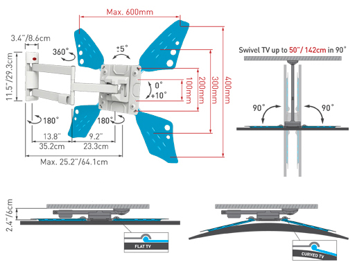 Standard VESA100x100, 200x200, 300x300, 400x400, 600x400 mm